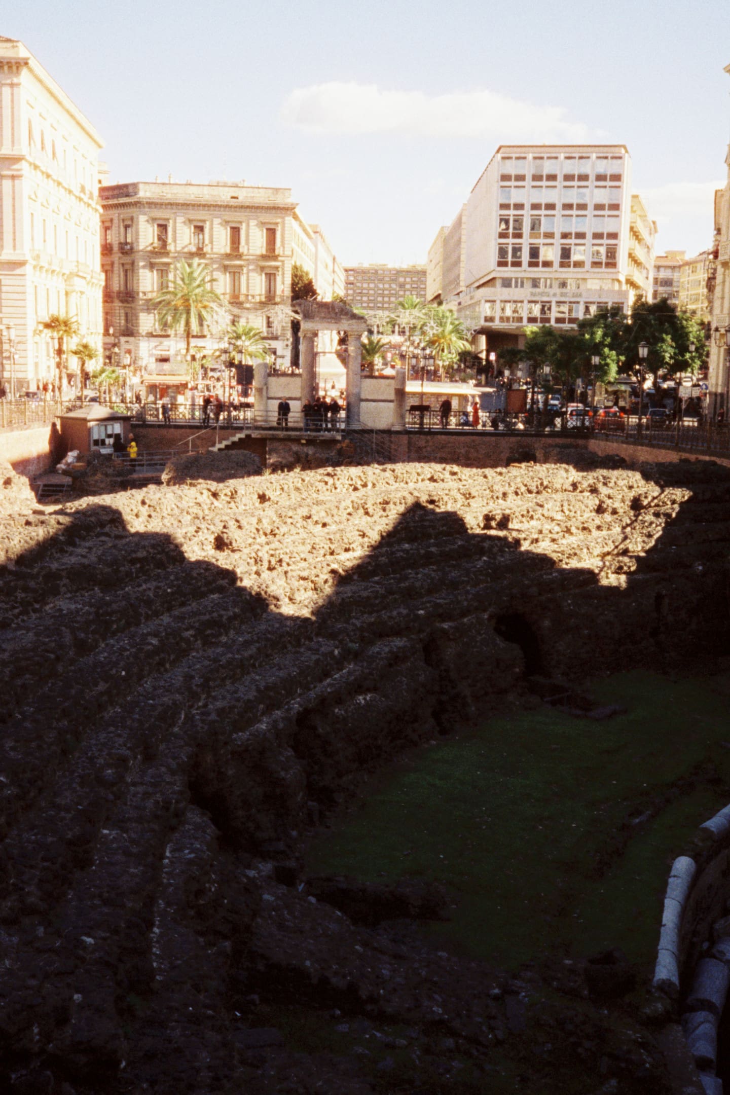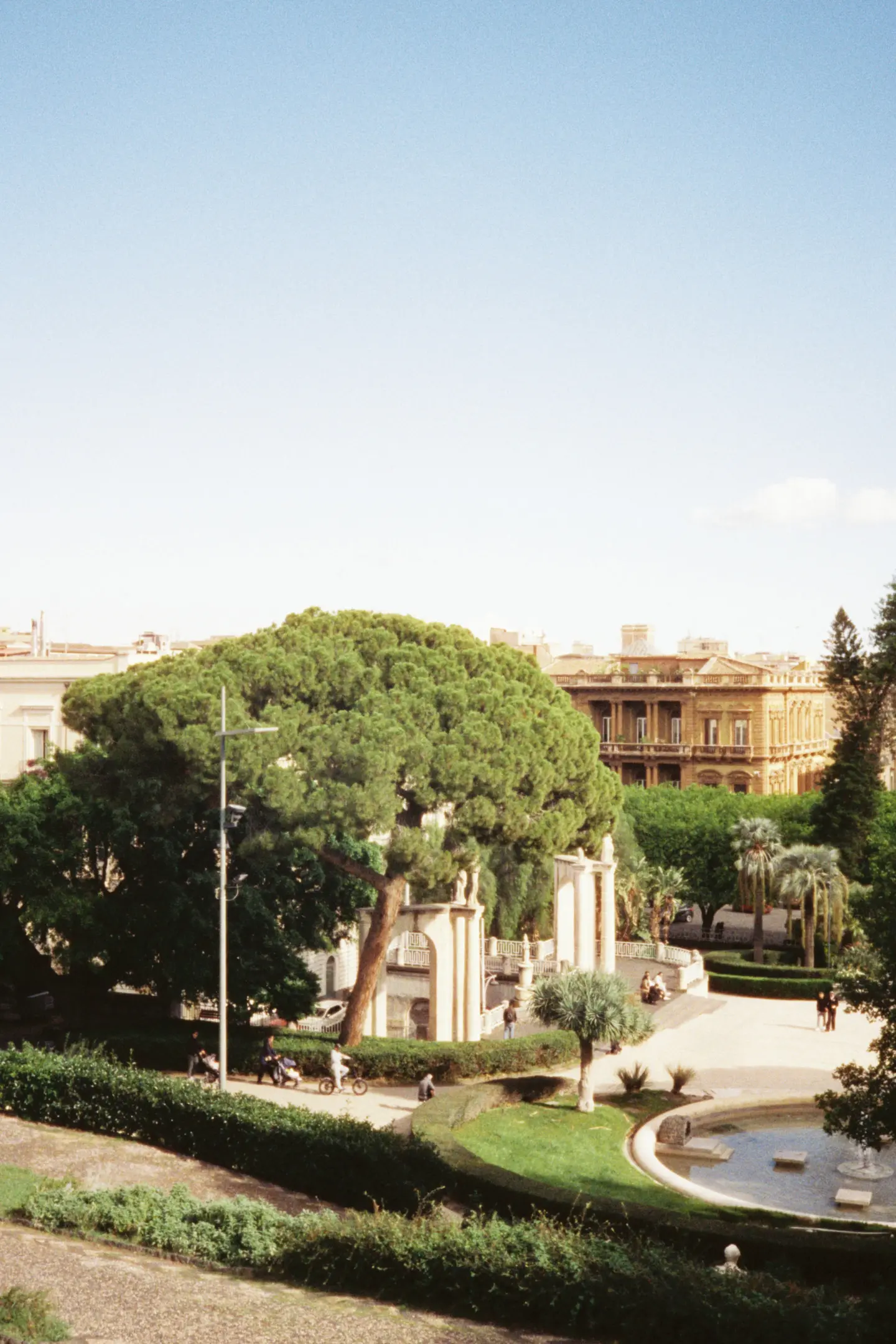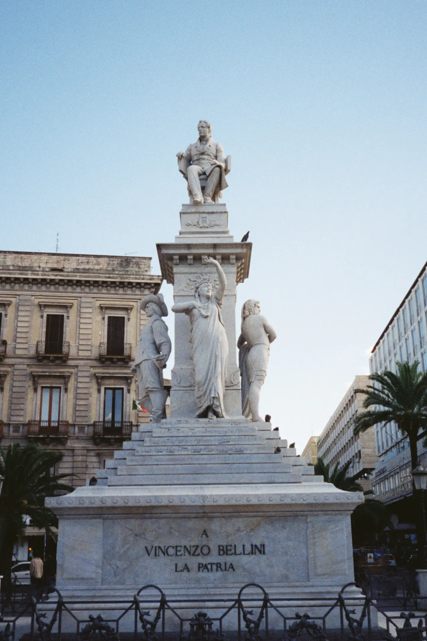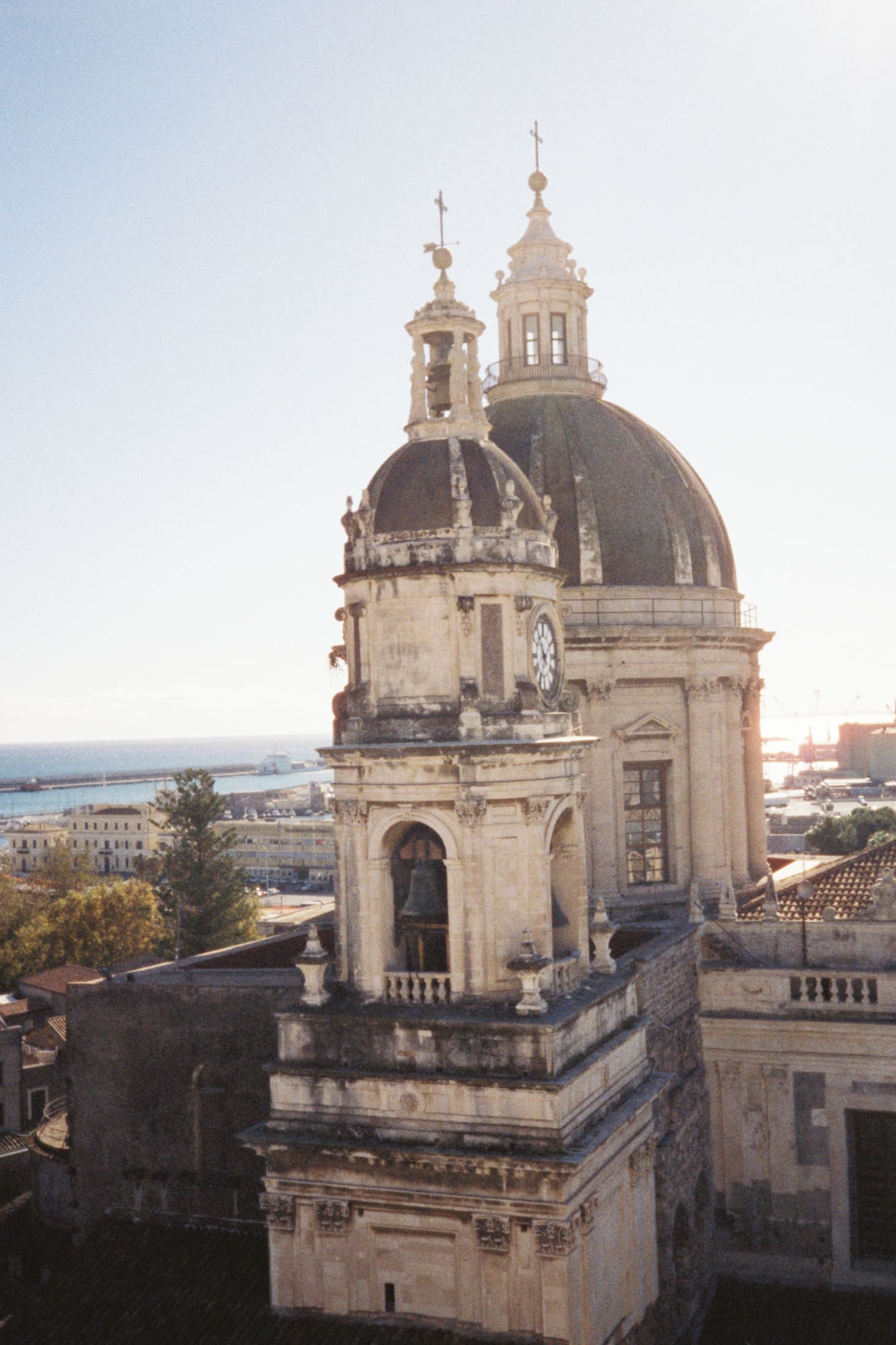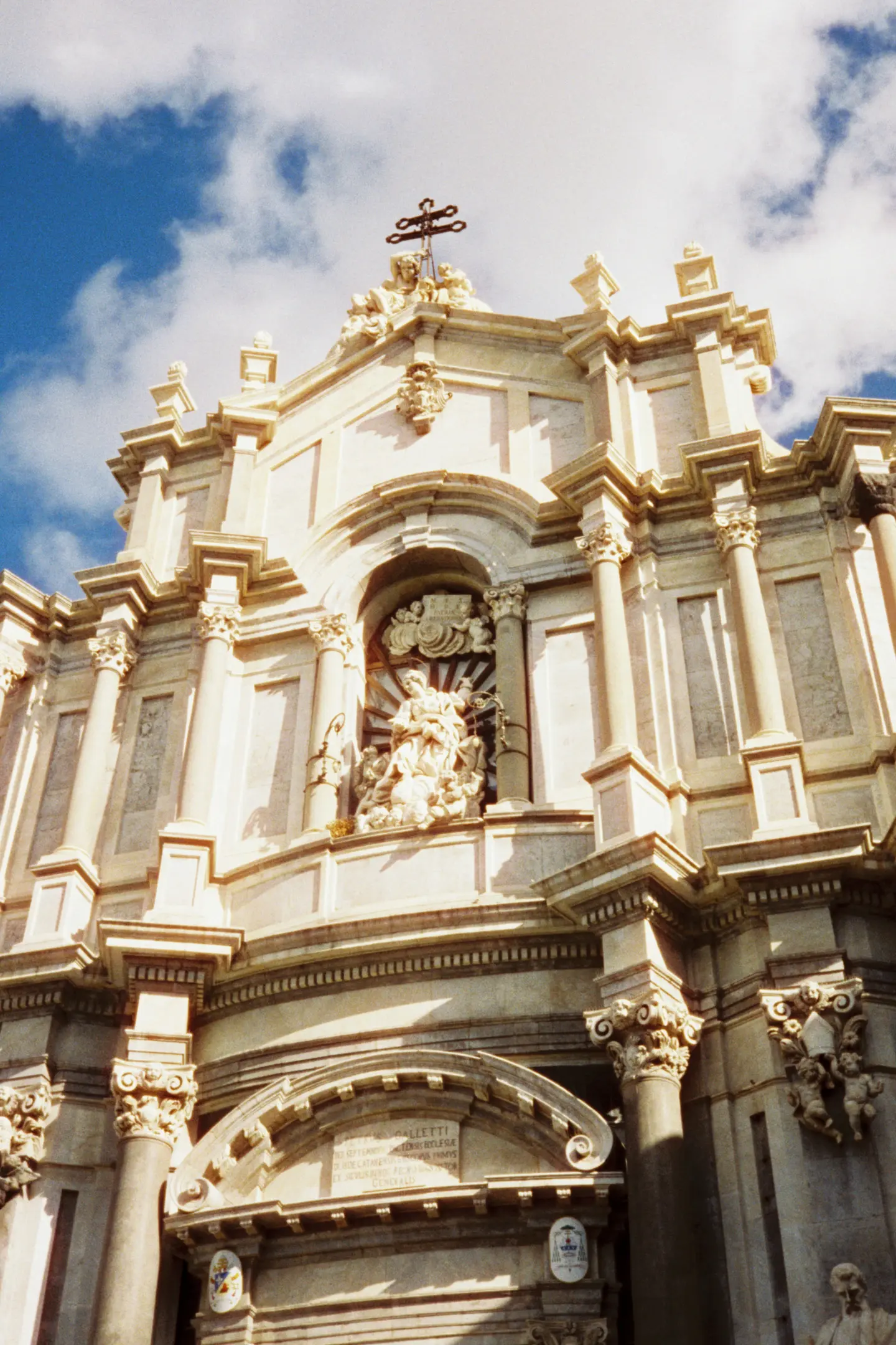 Ca să-ți oferim un pic de context, de ce am ales tocmai Catania pentru aventura asta? Ei bine, pentru că e genul ăla de oraș care nu încearcă să fie frumos. Catania e o lecție dură despre textură. E autentic până în măduva oaselor. Totul în jur e construit din piatră vulcanică neagră, smulsă direct din măruntaiele Etnei. Bazaltul întunecat domină arhitectura barocă și creează un contrast vizual incredibil, aproape violent, cu lumina albă, arzătoare, specific mediteraneană. Umbrele sunt grele, adânci, iar soarele de amiază decupează formele cu o precizie chirurgicală. Iar filmul? Filmul iubește drama acestui contrast.