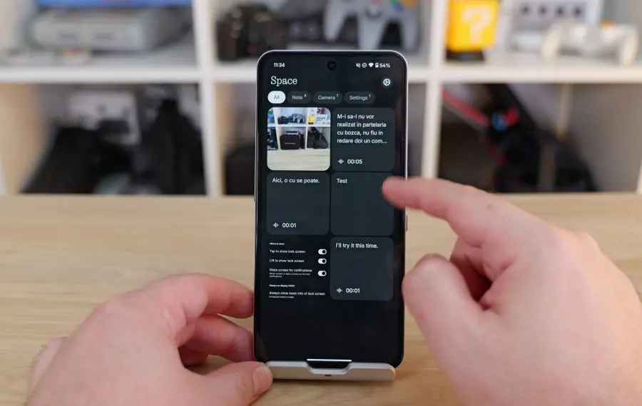 Dar asta nu este singura mea problemă cu el, ci acest buton m-a scos din sărite pe toată perioada testării. Acesta este Essential Key, butonul pe care l-am întâlnit și pe Nothing Phone 3a Pro. Acest buton salvează screenshot-uri sau fotografii din cameră drept notițe și le pune într-un spațiu personal care analizează informațiile cu AI. Poți ține apăsat pentru a înregistra un mesaj vocal atașat la imagine și apoi poți găsi totul într-un singur loc. Nu am nevoie de așa ceva și este limitat doar la dispozitive Nothing, deci nu le poți accesa de pe PC sau tabletă. Dar butonul în sine este enervant pentru că este fix sub butonul power și de multe ori când vreau să închid ecranul apăs pe el și fac un screenshot. Și nu, nu poate fi dezactivat sau reconfigurat decât cu comenzi din ADB.