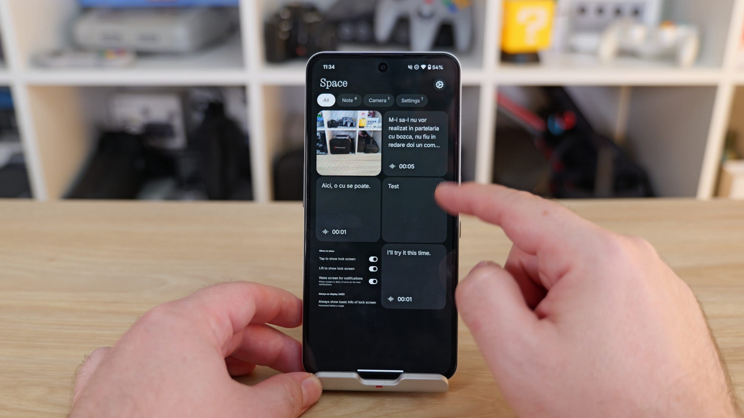 Dar asta nu este singura mea problemă cu el, ci acest buton m-a scos din sărite pe toată perioada testării. Acesta este Essential Key, butonul pe care l-am întâlnit și pe Nothing Phone 3a Pro. Acest buton salvează screenshot-uri sau fotografii din cameră drept notițe și le pune într-un spațiu personal care analizează informațiile cu AI. Poți ține apăsat pentru a înregistra un mesaj vocal atașat la imagine și apoi poți găsi totul într-un singur loc. Nu am nevoie de așa ceva și este limitat doar la dispozitive Nothing, deci nu le poți accesa de pe PC sau tabletă. Dar butonul în sine este enervant pentru că este fix sub butonul power și de multe ori când vreau să închid ecranul apăs pe el și fac un screenshot. Și nu, nu poate fi dezactivat sau reconfigurat decât cu comenzi din ADB.