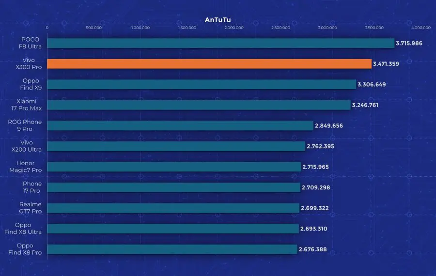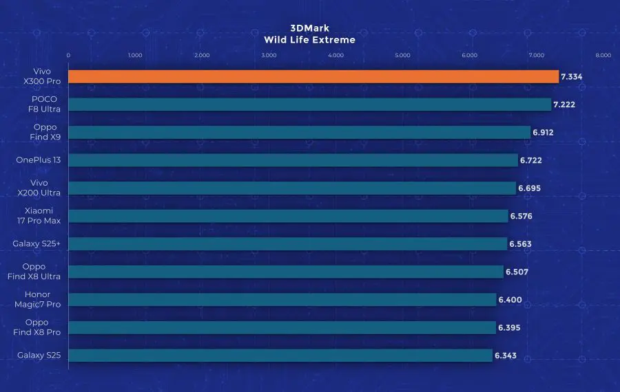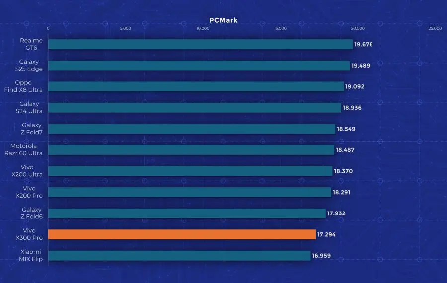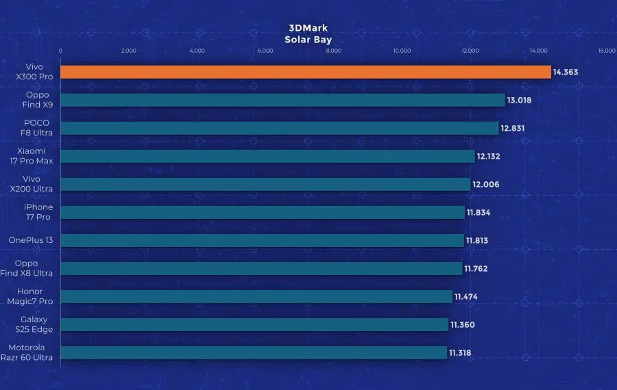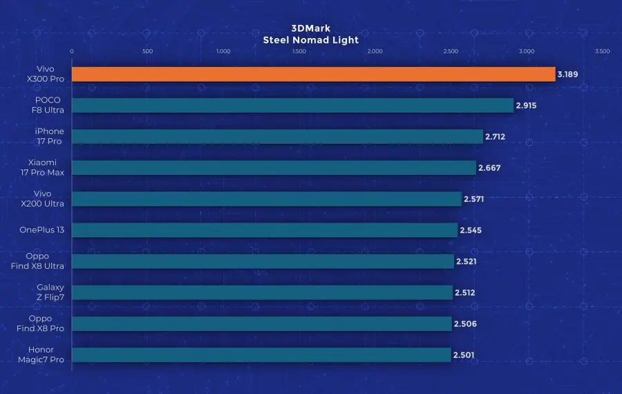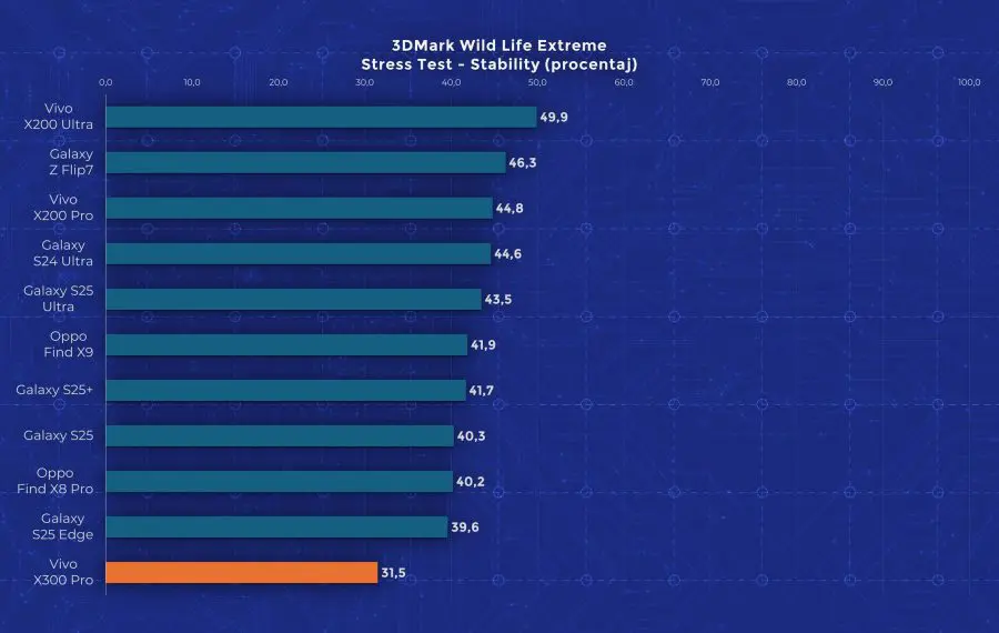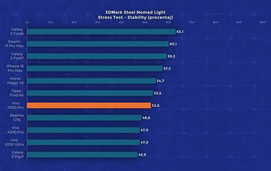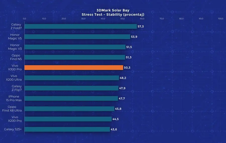 La nivel de performanță vedem însă un aport de la an la an. Cel mai mare upgrade pe care îl primește Vivo X300 Pro este la nivelul procesorului, fiind folosit noul Dimensity 9500, model pe care l-am mai testat și pe „vărul” lui, Oppo Find X9. Aveți un review aici pe canal. Acest procesor demonstrează din nou faptul că Mediatek a recuperat mult teren și chiar iese învingător peste Apple A19 Pro și Snapdragon 8 Elite Gen 5 în anumite teste. Așa cum era de așteptat, X300 Pro nu are o răcire foarte avansată, fiind un telefon concentrat pe partea foto. În testele de stres păstrează între 30 și 50% din performanță, decent dar nu ideal.