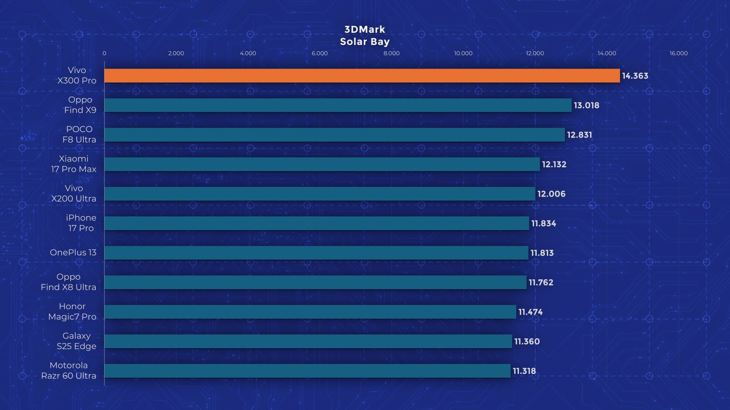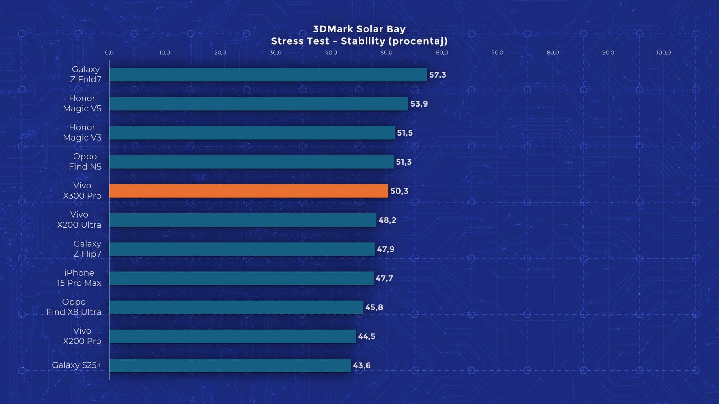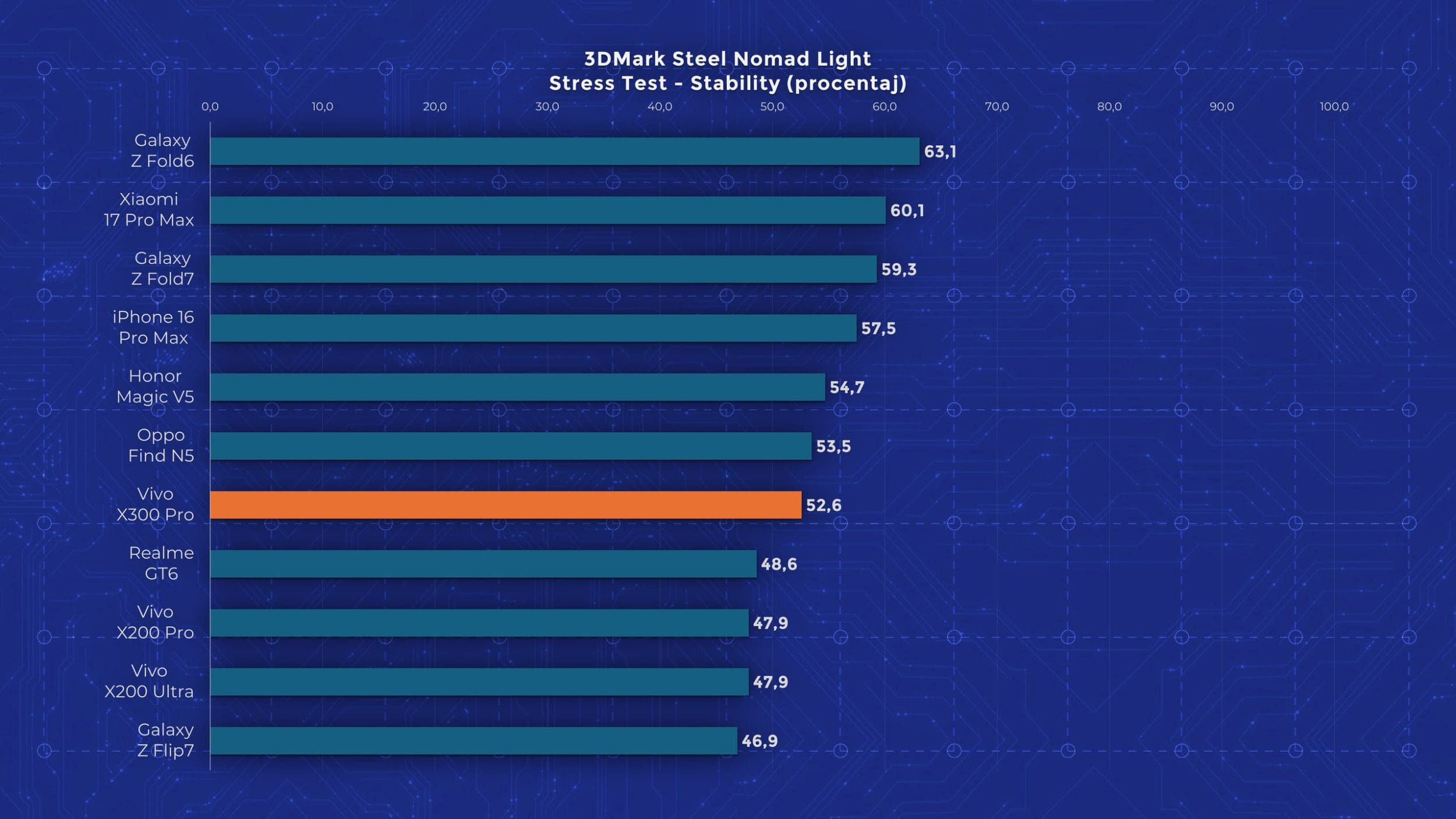 La nivel de performanță vedem însă un aport de la an la an. Cel mai mare upgrade pe care îl primește Vivo X300 Pro este la nivelul procesorului, fiind folosit noul Dimensity 9500, model pe care l-am mai testat și pe „vărul” lui, Oppo Find X9. Aveți un review aici pe canal. Acest procesor demonstrează din nou faptul că Mediatek a recuperat mult teren și chiar iese învingător peste Apple A19 Pro și Snapdragon 8 Elite Gen 5 în anumite teste. Așa cum era de așteptat, X300 Pro nu are o răcire foarte avansată, fiind un telefon concentrat pe partea foto. În testele de stres păstrează între 30 și 50% din performanță, decent dar nu ideal.