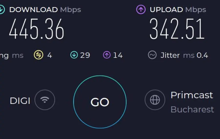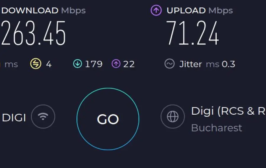 În studio și-n living situația a fost diferită, că acolo distanța e și mai mică, iar pereții sunt câte unul spre fiecare cameră. Deci nici un router stock nu este o alegere rea din punct de vedere al vitezei. Dar TP-Link Archer BE450 mi-a dat un upgrade decent și aici, plus că m-a scăpat și de problemele cu pierderea conexiunii. Țineți cont că în cazul vostru rezultatele pot varia în funcție de câte conexiuni mai sunt în vecinătate și de cât de buncăr este locuința. Eu stau la bloc, vecinii mei sunt tinerei și colcăie apartamentele de rețele, așa că este de așteptat să nu trag la maxim de conexiunea la net.