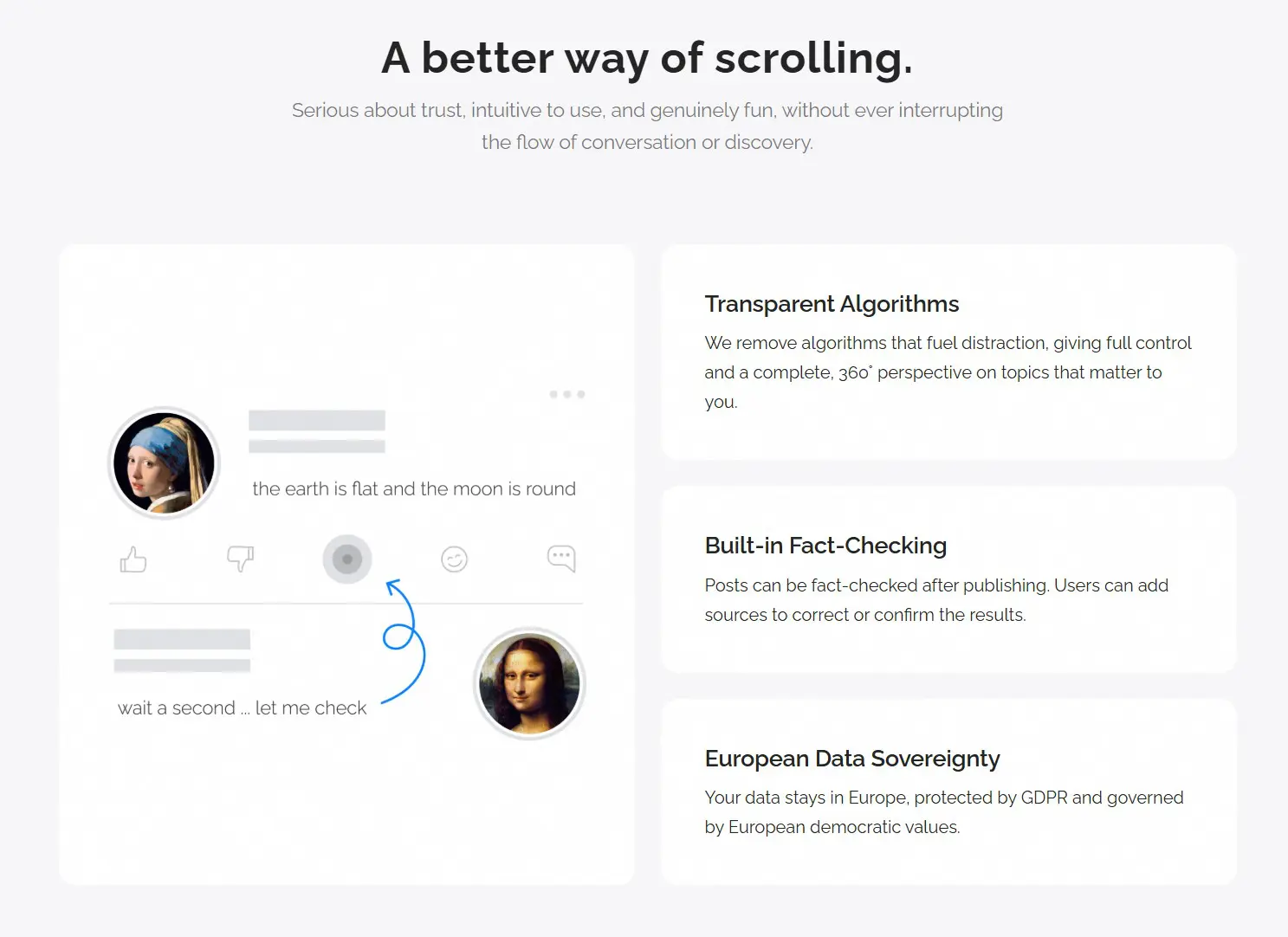 Elementul central al noii aplicații constă într-un sistem de fact-checking integrat direct în structura rețelei. Utilizatorii vor avea capacitatea de a verifica instantaneu acuratețea postărilor, utilizând surse neutre și asistență bazată pe inteligența artificială. Această funcție este concepută tehnic pentru a nu întrerupe fluxul normal al conversației online. „Ideea pentru eYou a apărut dintr-o observaţie simplă: social media s-a îndepărtat foarte mult de scopul său iniţial”, a declarat Grégoire Vigroux pentru Ziarul Financiar.