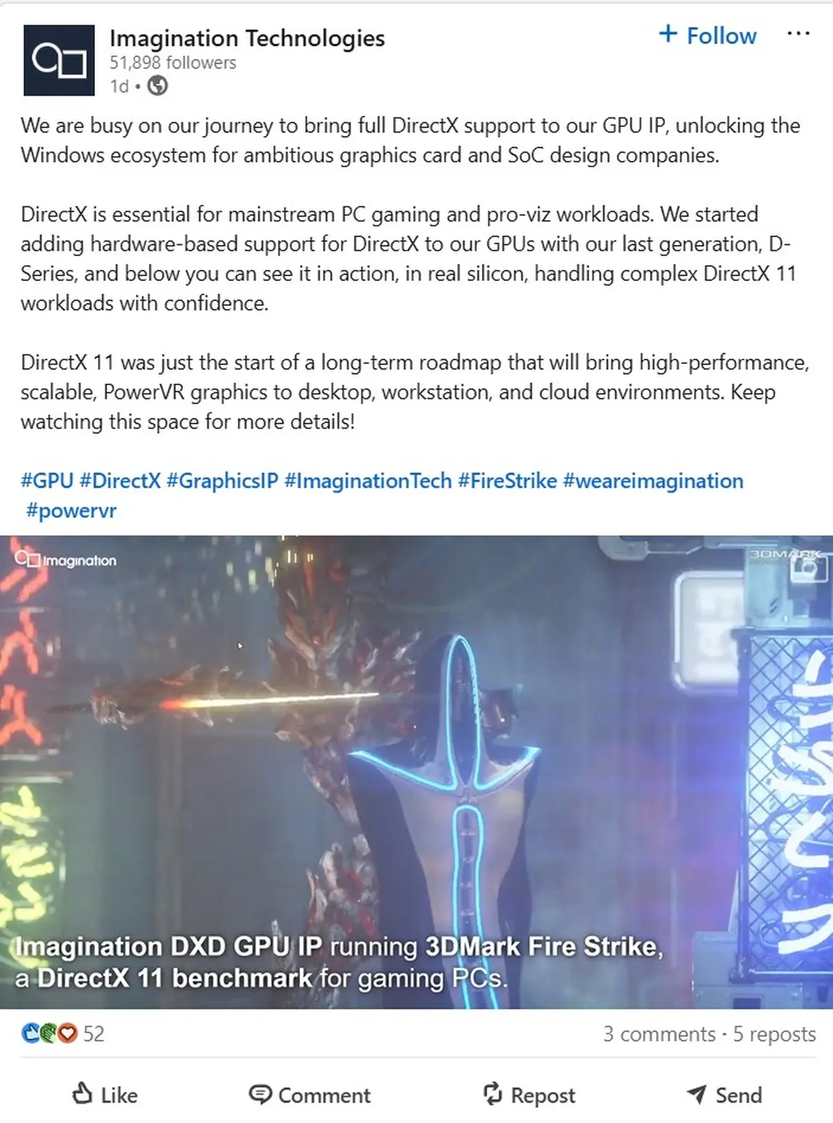 Compania sugerează o direcție clară, oferind o demonstrație de 3DMark Fire Strike rulând pe un GPU PowerVR compatibil DirectX 11, semn că tehnologia începe să prindă contur real. Unul dintre cele mai importante obstacole pentru Imagination în trecut a fost lipsa suportului solid pentru API-uri moderne de gaming. Acum, compania confirmă oferă suport hardware pentru DirectX.