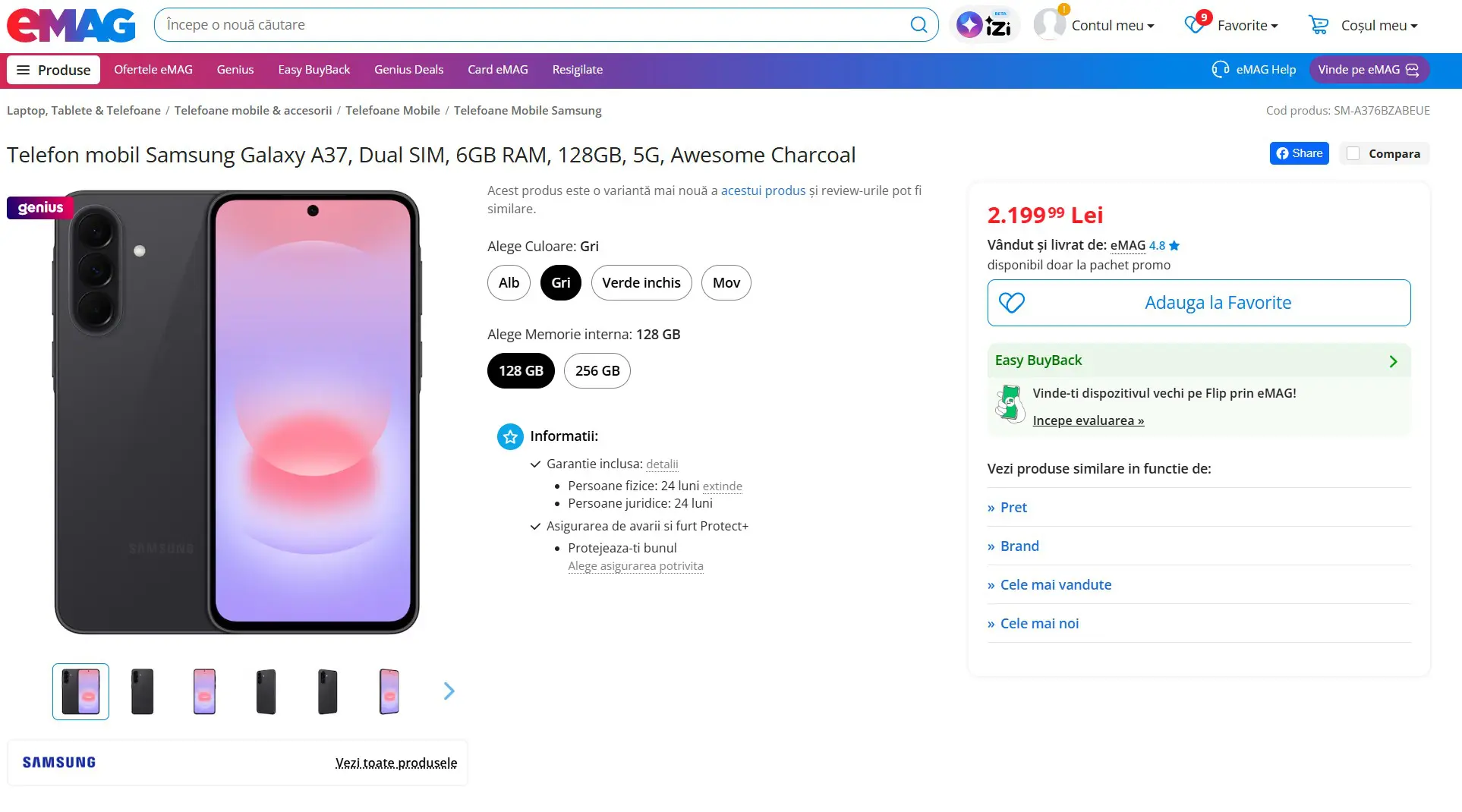 Pentru Galaxy A37 avem configurații cu 6+128 GB și 8+256 GB la prețuri de 2.199 lei, respectiv 2.649 lei. Galaxy A36 pornea de la 1.899 lei anul trecut în aceeași configurație de bază. Culorile sunt Alb, Gri, Verde închis și Mov, iar la nivel de specificații avem un procesor 8-core la 2.75 GHz.