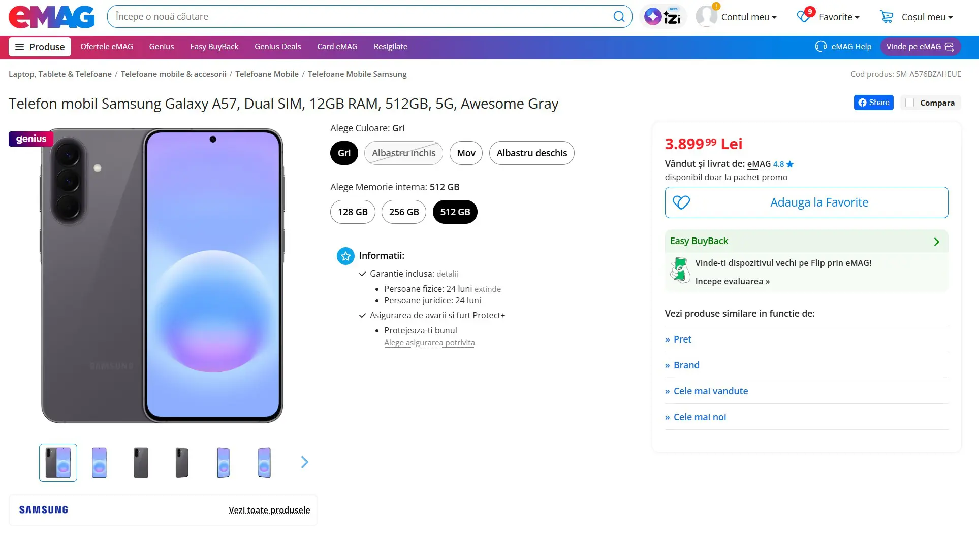 Galaxy A57 vine în trei variante de stocare: cu 128, 256 și 512 GB. Modelul de bază, cu 8+128 GB pornește de la 2.699 lei, față de 2.400 lei cât costa Galaxy A56 la lansare. Vedem astfel o scumpire de 300 de lei de la un an la altul. De asemenea, modelul 8+256 este listat la 2.999 lei. Varianta de top, cu 12 GB RAM și 512 GB stocare costă 3.899 lei, aproape cât un Galaxy S26 „de bază” cu 12 GB RAM și 256 stocare.