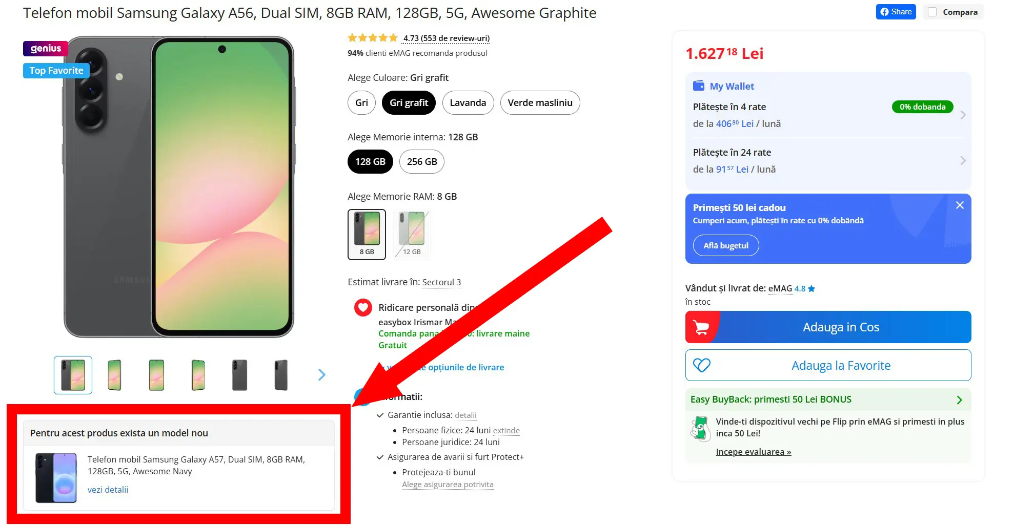 Deși astăzi, 25 martie, la 14:00 este așteptat anunțul oficial pentru Galaxy A57 și A37, magazinul online eMAG a listat deja produsele. Deși acestea nu apar în căutări pe platformă și nu există încă bannere care să le promoveze, dacă intri pe pagina de produs a modelelor anterioare, A56 și A36, există o căsuță care atenționează că a apărut un model mai nou. Astfel, putem confirma o parte dintre specificații, prețurile în lei, culorile, cât și design-ul oficial. Prețurile suferă însă o creștere majoră de la un an la altul, Galaxy A57 pornind de la 2.700 de lei.