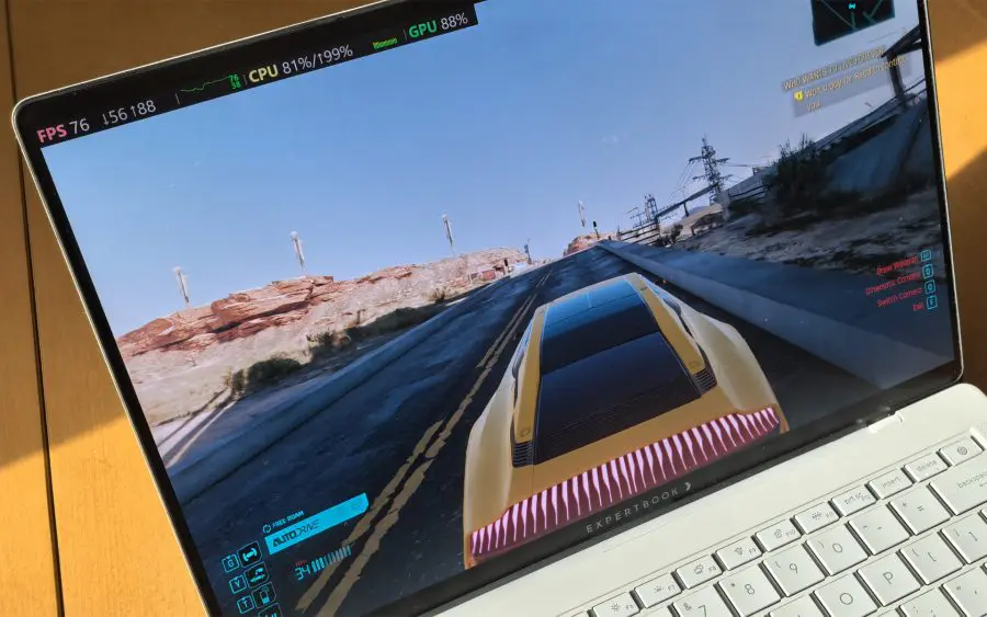 Intel Core Ultra X7 358H oferă o configurație cu 16 nuclee și frecvență Boost de până la 4.8GHz. Acestea sunt însoțite de un NPU cu o capacitate de 50 TOPS INT8 care alimentează aplicațiile cu inteligență artificială și suportă Co-Pilot+. Dar ce m-a lăsat cu gura căscată este soluția grafică integrată. Intel ARC B390 reușește să livreze performanțe foarte bune în gaming, rulând Cyberpunk 2077 cu peste 60FPS la setări Medium la rezoluția 1920×1200. Iar toată această performanță vine cu un consum de numai 50W.
