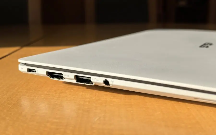 Cu un consum atât de mic, nici bateria nu are o sarcină chiar atât de grea. Deși nu are specificații ieșite din comun, optimizările hardware îi lungesc semnificativ durata de viață, astfel că laptopul rezistă peste 15 ore de utilizare light. Vorbim aici de navigat pe internet, redactat de articole, urmărit chestii pe YouTube și ascultat muzică pe Spotify. Luminoziatatea a fost mereu pe la 50%, iar la net m-am conectat prin Wi-Fi. În gaming obținem circa 4-5 ore, doar că pe baterie nu vei putea folosi procesorul la capacitate maximă. Pentru putere brută este necesar încărcătorul.