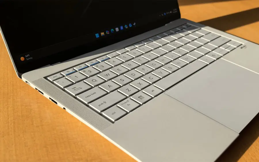 Touch-screen-ul este doar una dintre metodele de input, cealaltă fiind combinația clasică de tastatură plus touchpad. Despre tastatură nu-s multe de zis, este o tastatură normală de laptop cu iluminare albă sub taste, care se întinde pe aproape toată suprafața șasiului, minus cele două fante pentru difuzoare. Însă ce m-a surprins tare la ExpertBook Ultra a fost touchpad-ul cu feedback haptic. Acesta este acoperit cu sticlă și oferă un nivel de acuratețe foarte ridicat, iar în locul click-ului vorbim despre un sistem de vibrații. Iar cireașa de pe tort este dimensiunea touchpad-ului, fiind unul dintre cele mai mari pe care le-am văzut pe un laptop.