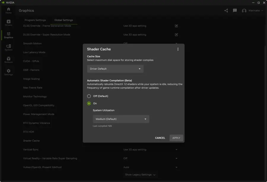 Dacă vreți să încercați funcția Auto Shader Compilation va trebui să instalați versiunea Beta a NVIDIA App (din meniul aplicației) și să faceți update la driver-ul GeForce Game Ready Driver 595.997 WHQL sau mai nou. Odată ce aveți toate cele necesare, puteți găsi setarea numită Shader Cache sub meniul de setări globale. De aici veți putea alege cât de mult spațiu poate fi ocupat de shadere și cât de tare poate fi solicitat sistemul în idle.