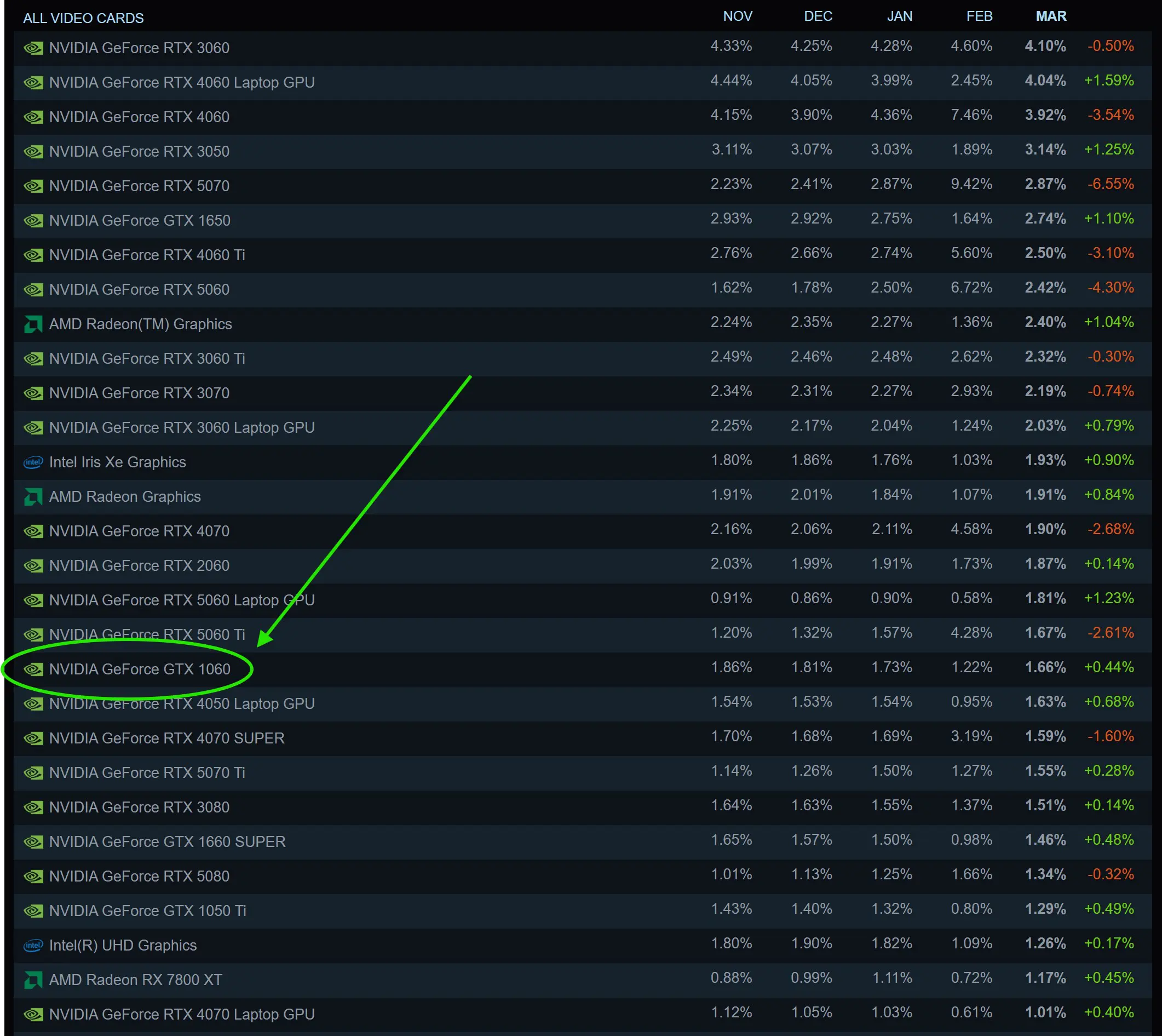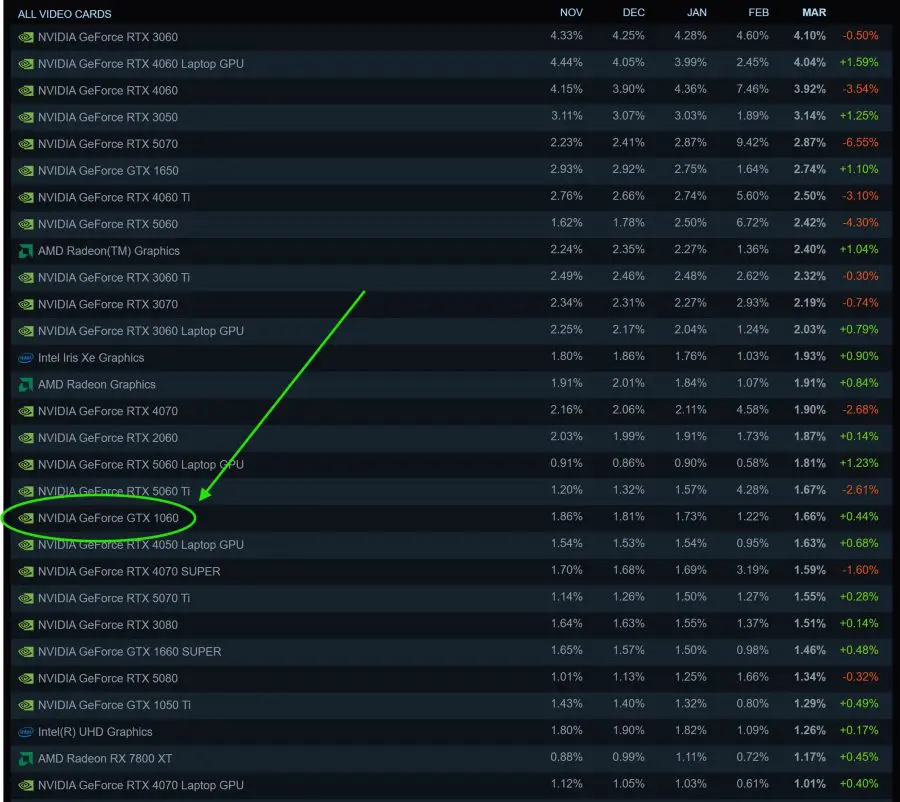 Ca să înțelegeți cât de bine a rezistat GeForce GTX 1060 în timp, e de ajuns să aruncați un ochi peste Steam Hardware Survey. Iar aici vedem clar că placa video veche de 10 ani este mai populară decât modele contemporane precum NVIDIA GeForce RTX 5070 Ti sau GeForce RTX 3080. Mai impresionant decât atât este faptul că GeForce GTX 1060 este în continuare mai populară decât orice placă video de la AMD, ceea ce spune multe despre poziția în piață a celor doi producători și despre relația acestora cu publicul.