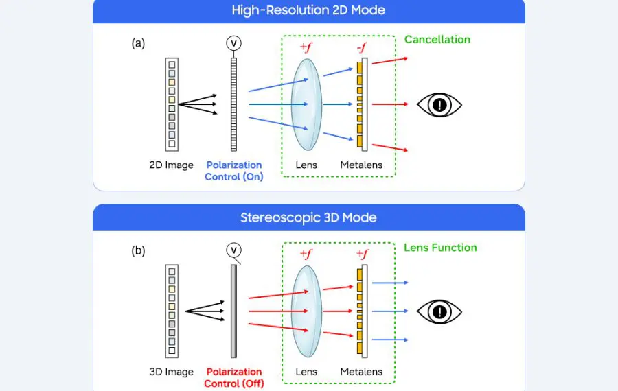Spre deosebire de straturile lenticulare tradiționale, această soluție folosește structuri la scară nanometrică pentru a direcționa precis lumina spre ochii utilizatorului. Comutarea dintre modul 2D standard și cel 3D imersiv se face prin control de tensiune, iar utilizatorul poate activa sau dezactiva efectul de adâncime în timp real, prin ajustarea stărilor de polarizare.