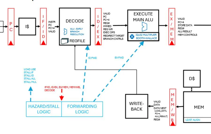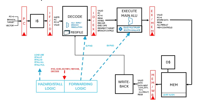 Diagrama pipeline-ului final arată un design cu rezolvare timpurie a branchurilor, forwarding logic, hazard/stall logic, Booth-Wallace multiplier și etapele clasice IF, ID, EX, MEM și WB. Autorii spun că agentul a testat mai multe variante, inclusiv unele cu penalizare de branch de 2 cicluri și altele cu penalizare de 1 ciclu, înainte de a alege varianta cu performanța mai bună.