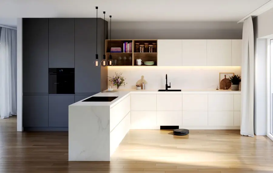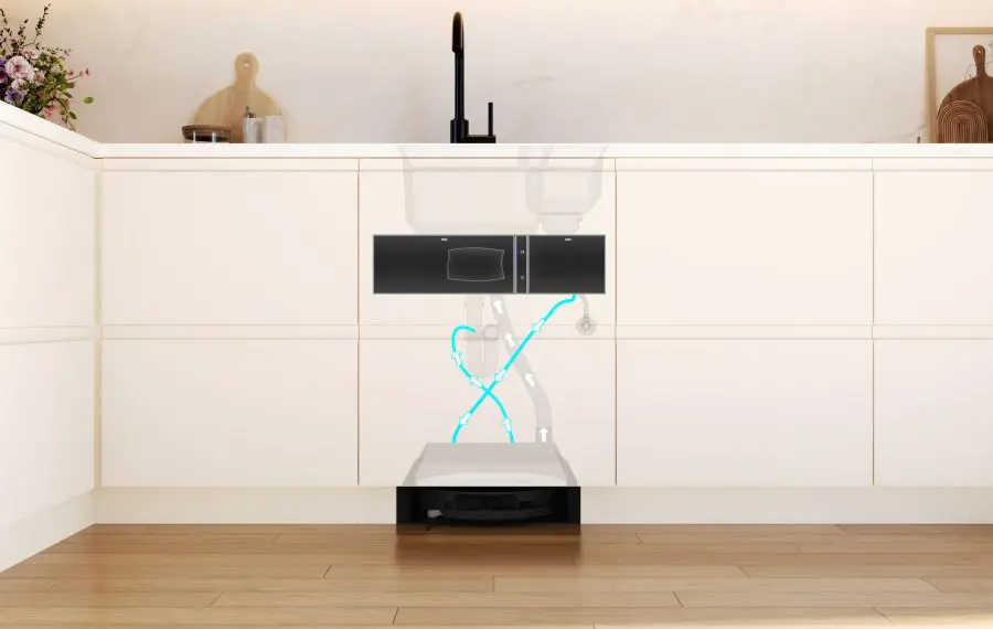 Robotul aspirator și mop Bosch este gândit să dispară vizual din locuință atunci când nu este folosit. Stația se montează în corpul de sub chiuvetă, iar robotul intră și iese singur printr-o ușă automată integrată în plintă.